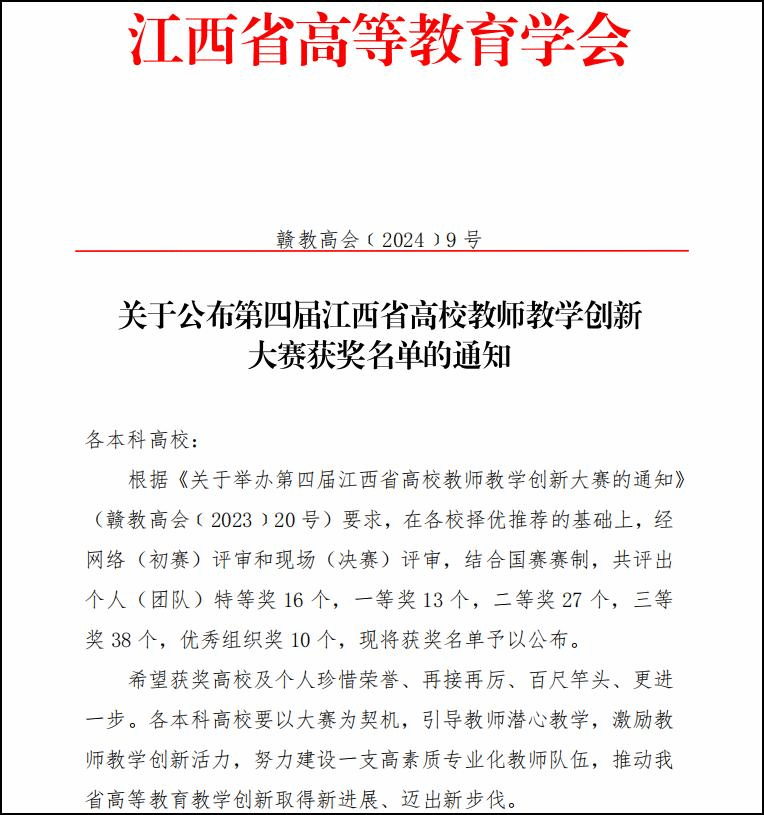 日前,由江西省教育厅指导、江西省高等教育学会主办的第四届江西省高校教师教学创新大赛在江西科技师范大学落下帷幕。永利yl23411集团官网机械与智能制造学院胡云堂教师(团队)荣获新工科副高组二等奖;电子信息工程学院张波教师(团队)荣获新工科中级及以下组三等奖;资源环境学院尹宁宁教师(团队)荣获课程思政中级及以下组三等奖。