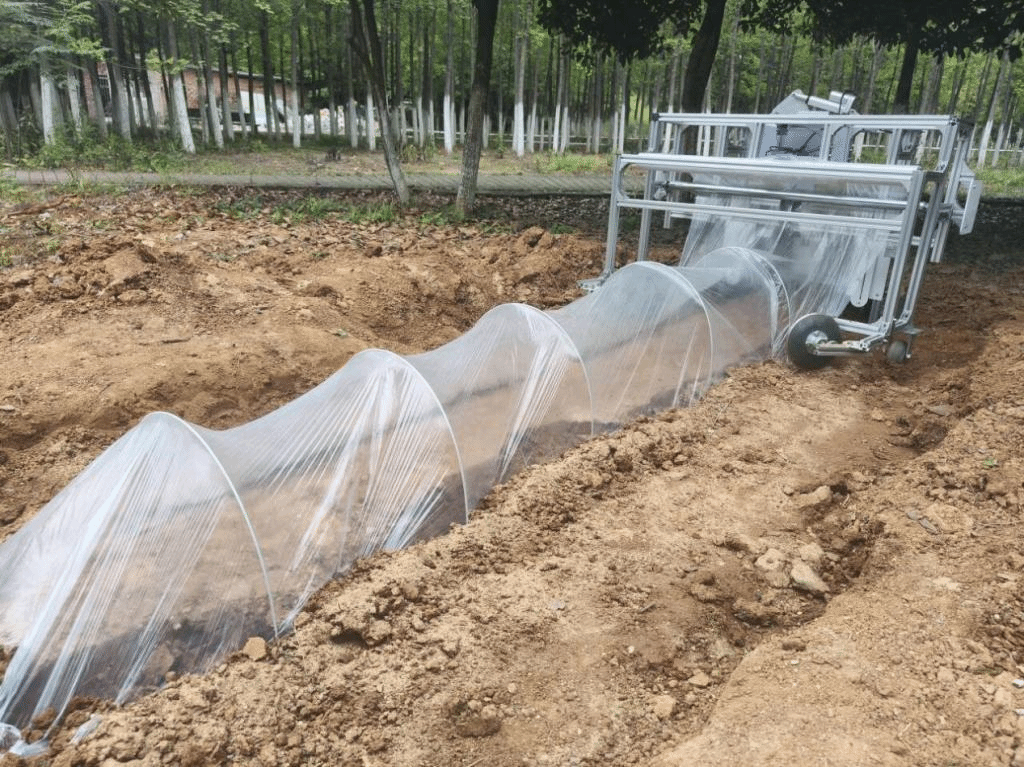 一种自动化小拱棚插杆覆膜一体机