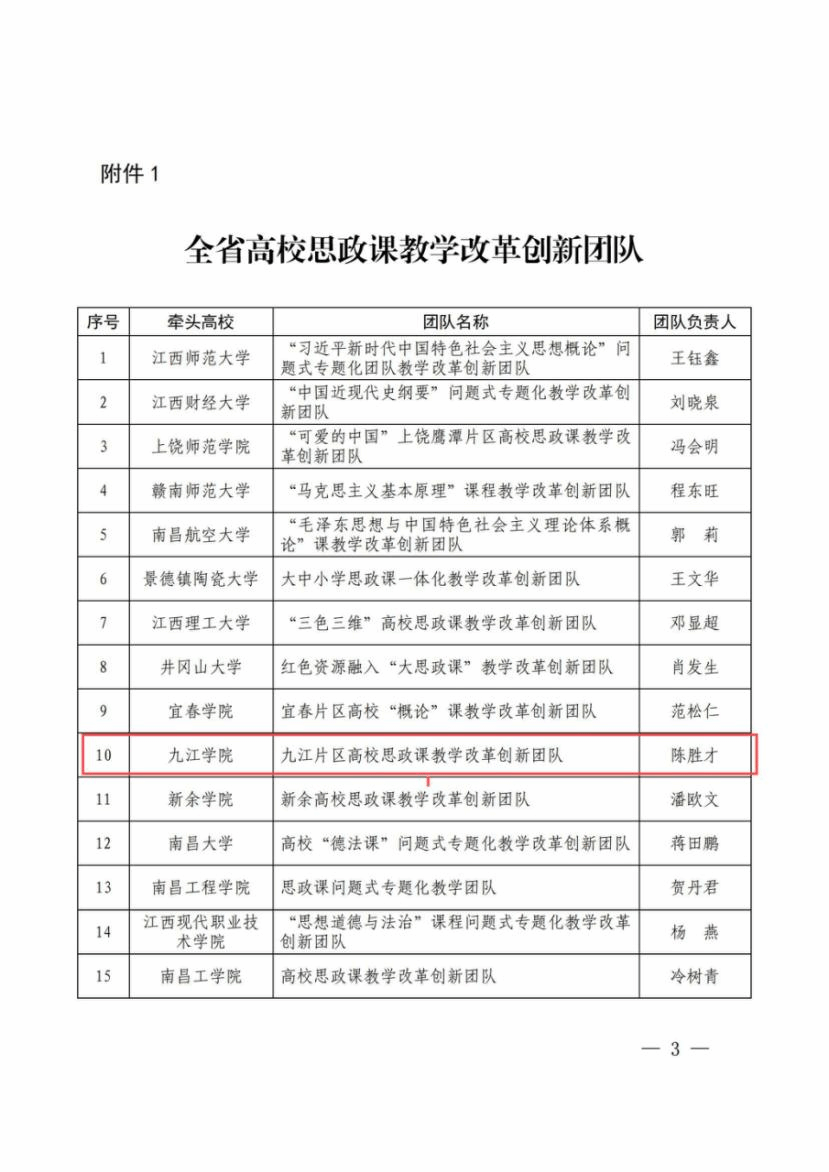 牢固树立思政课建设是马克思主义学院第一要务的立院导向,以问题为导向,聚焦学生成长成才需求,以改革创新为动力,深化思政课程改革,提高思政课的亲和力和针对性,确保思政课入耳、入脑、入心,努力提升思政课育人实效。2021年以来,作为九江片区思政课问题式专题化团队教学改革牵头单位,围绕全省思政课问题式专题化团队教学改革试点开展课堂教学改革,在专题设计、问题凝练、课件制作、教案撰写、资源建设等方面进行大胆改革创新,全面提高学校思政课质量和水平。2022年,学院教师在全省高校思政课教师教学比赛中取得优异成绩,在大赛上共获得一等奖2项、二等奖2项。在省青年教师教学比赛(思政专项)中获得三等奖1项。