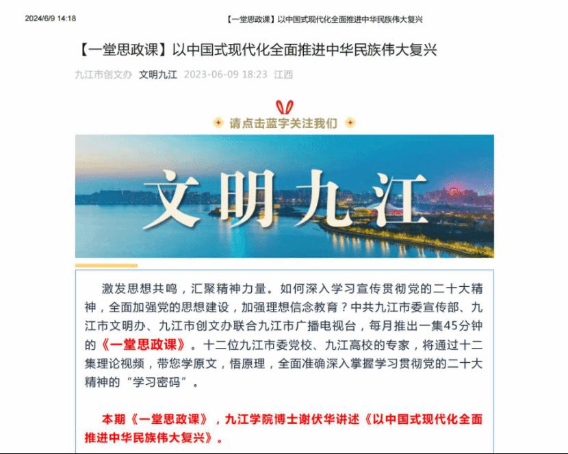 中共九江市委宣传部、九江市文明办、九江市创文办联合九江市广播电视台举办《一堂思政课》,九江学院谢伏华博士讲述《以中国式现代化全面 推进中华民族伟大复兴》