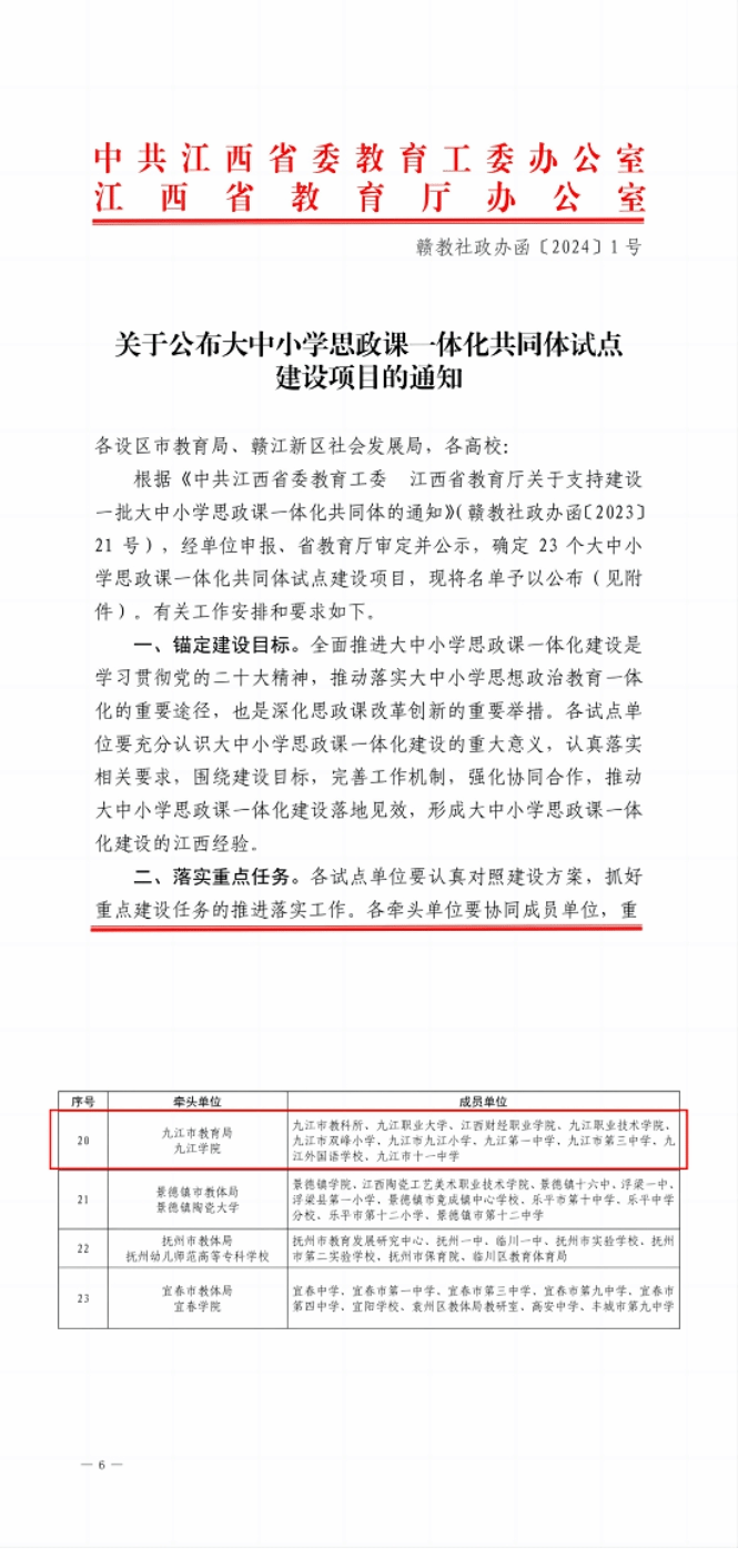 编者按:九江学院第一次党代会以来,学校党委坚持以习近平新时代中国特色社会主义思想为指导,深入贯彻落实习近平总书记关于高等教育的重要论述,团结带领全校师生员工,积极抢抓机遇,改革创新,担当作为,学校办学水平和综合实力迈上新台阶。为迎接学校第二次党代会胜利召开,校园网特推出“喜迎党代会·发展巡礼”专栏,持续刊发各二级学院、机关部门和科研机构经验材料,全面回顾总结第一次党代会以来学校各方面取得的发展成果,激励全校师生员工担当实干、锐意进取,以优异成绩向学校第二次党代会献礼!