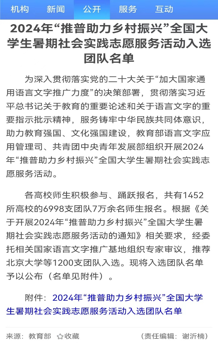 近日,九江学院文学院组织申报的“文小青”志愿服务队入选由教育部语言文字应用管理司、共青团中央青年发展部组织开展的2024年“推普助力乡村振兴”全国大学生暑期社会实践志愿服务队。本次活动共有1452所高校的6998支团队,共计7万余名师生报名参与,经过严格的专家审议,永利yl23411集团官网文学院团队成功入选。