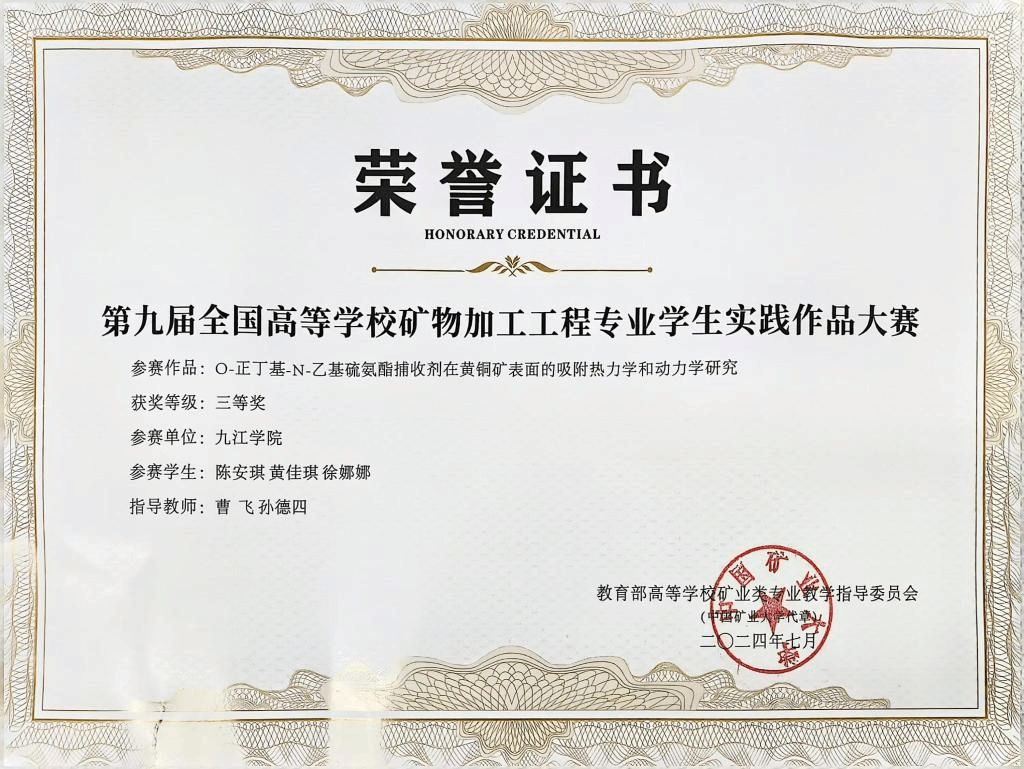 近日,第九届全国高等学校矿物加工工程专业学生实践作品大赛在福州市举行。由永利yl23411集团官网化学化工学院陈安琪、黄佳琪和徐娜娜等3位同学完成,曹飞、孙德四老师指导的参赛作品——“O-正丁基-N-乙基硫氨酯捕收剂在黄铜矿表面的吸附热力学和动力学研究”,在激烈的竞争中脱颖而出,荣获全国三等奖。