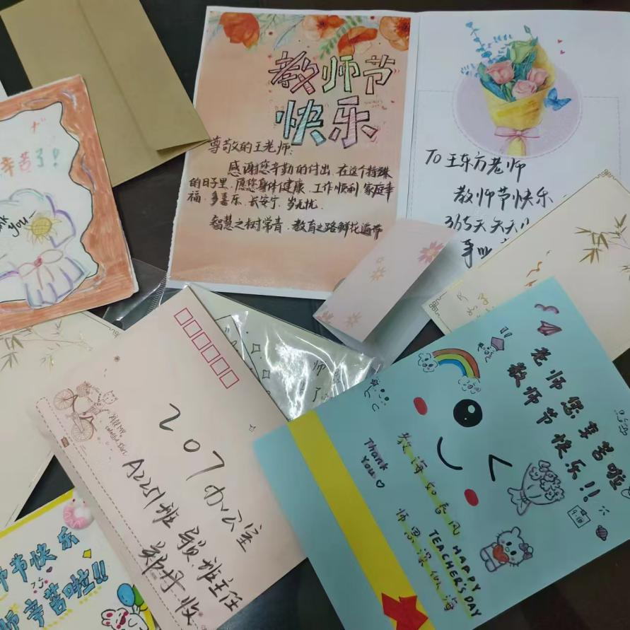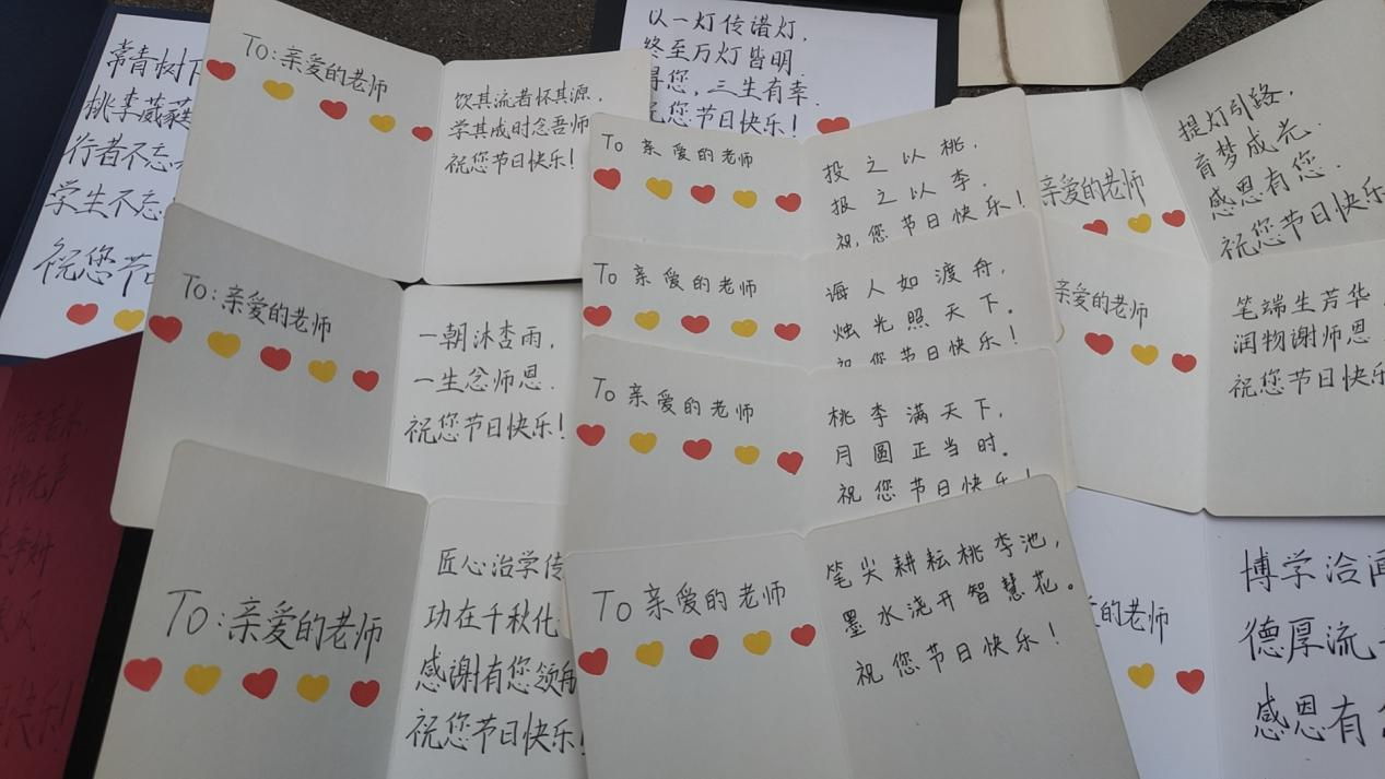 桃李自芬芳述真情教师节期间,学校团委组织同学们为老师制作节日贺卡,通过文字的形式表达对老师们的感恩和真挚问候。收到贺卡的老师们纷纷表示,同学们温暖的诗词让她们真切地感受到了作为一名教育工作者的幸福感和自豪感。