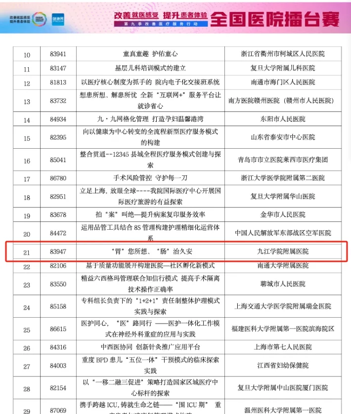 近日,由国家卫生健康委员会医政司指导,《健康界》联合主办的2024年第九季改善医疗服务行动全国医院擂台赛圆满落幕。九江学院附属医院在“X创新探索”主题领域的参赛项目《“胃”您所想、“肠”治久安》成功入围并荣获华东赛区优秀案例奖。