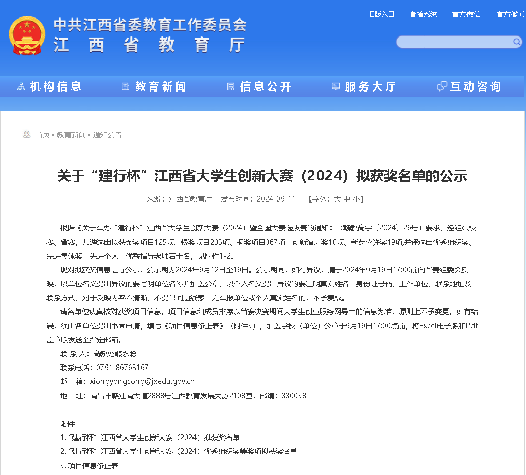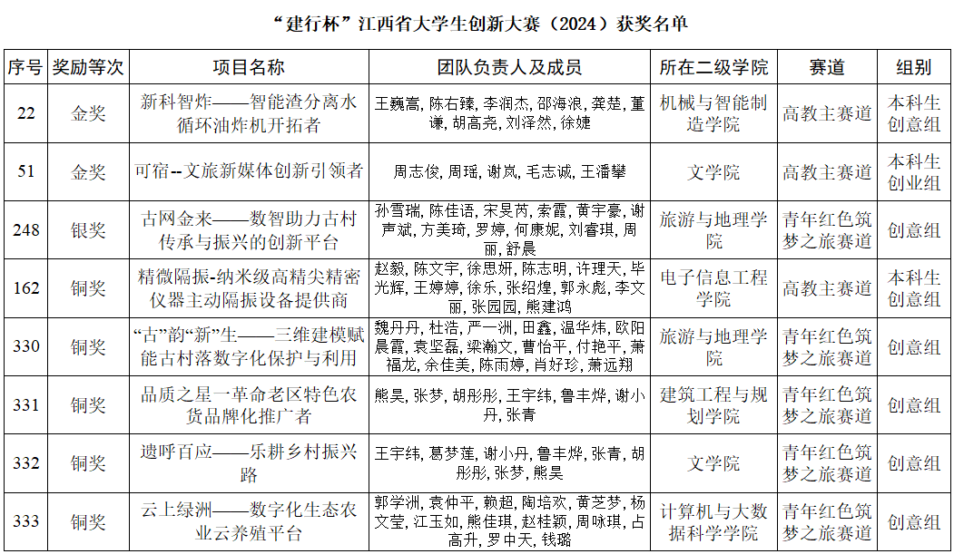 近日,“建行杯”江西省大学生创新大赛(2024)暨全国大赛选拔赛获奖名单全部揭晓。永利yl23411集团官网师生在本项大赛中取得较大的历史性突破,首次突破省赛金奖,获奖层次和数量均有较大程度的提升,获省赛金奖2项、银奖1项和铜奖5项的团体佳绩,其中2个金奖项目推荐进入全国总决赛。