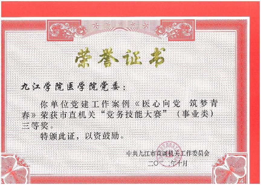 思政教育突显专业与创新。学院通过“六个一工作模式”创新思政教育方式,打造思政教育课外平台:一个“医心向党”红色学习小组,一个“医心向党”红色走读小分队,一支九医杏林青年志愿者服务队,一个九医立德讲坛,一个“九医杏林园”团委微信公众号,一个“医心聊吧”交流平台。“医心向党”红色走读作品分别荣获第十八届“挑战杯”红色专项校赛特等奖和二等奖。九医杏林青年志愿者服务队已与十多个单位建立对接志愿服务关系,暑期结合“三下乡”开展志愿服务活动,获“九江日报”“江西思政”“中央共青团”等主流媒体报道,并被九江市授予优秀志愿服务队,获得2023年全国大中专学生“三下乡”社会实践活动之乡村振兴“笃行计划”专项行动全国示范性团队;荣获全国善行100志愿活动“爱心团体”;入选2024年全国大学生井冈山精神志愿宣讲团。“九医杏林园”微信公众号传递正能量牢牢占领学生思想阵地,获九江学院2020年度最受喜爱新媒体奖、2023年度优秀新媒体账号。
