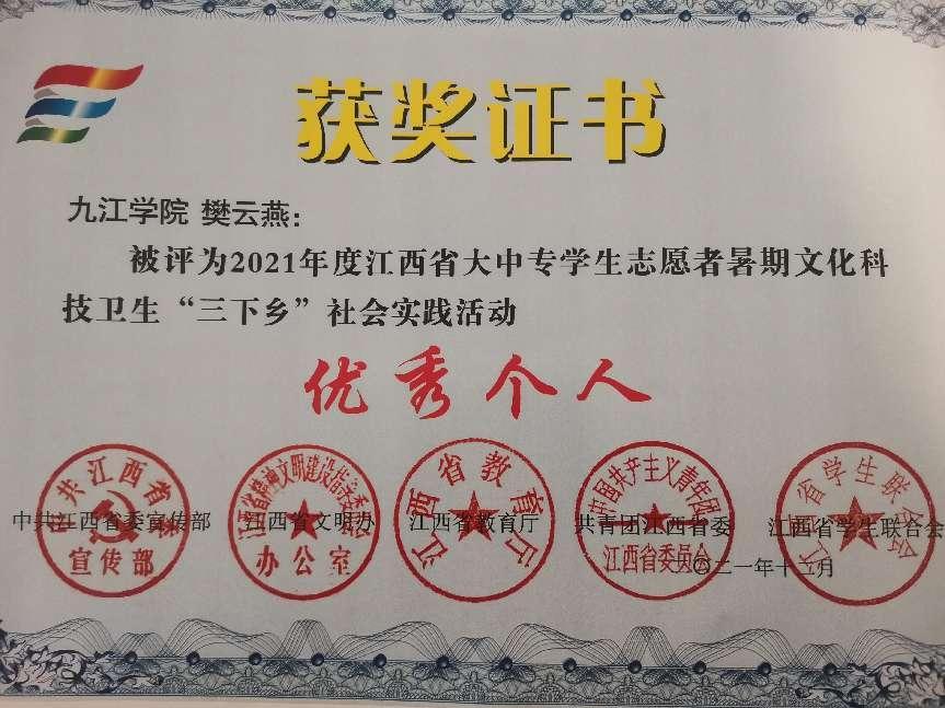 人才培养再显育人成效。2名学生获评“2020年九江市优秀共青团员”;学院团委获评2022年“九江市五四红旗团委”;2名学生干部荣获“浔阳区优秀共青团员”“九江市优秀志愿者个人”等称号。