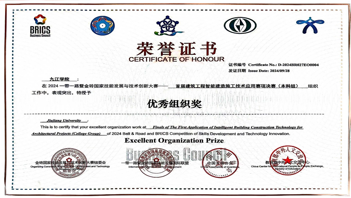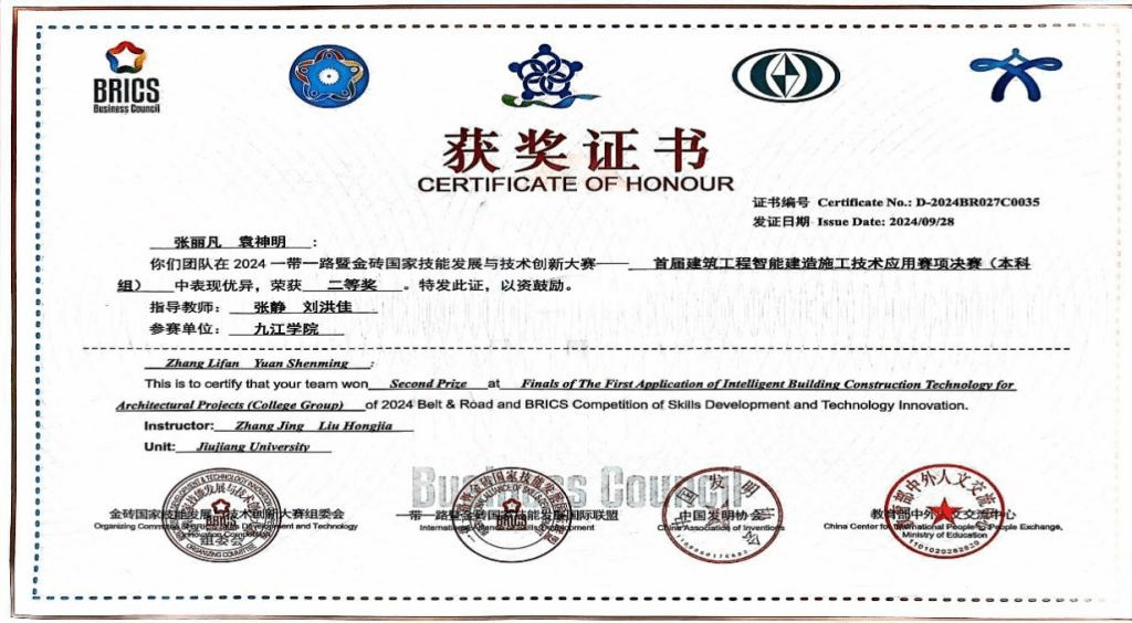 近日,2024一带一路暨金砖国家技能发展与技术创新大赛首届建筑工程智能建造施工技术应用赛项全国总决赛在杭州圆满落幕。本届智能建造赛项决赛经过前期覆盖全国600余所高校的校园赛及区域选拔赛,最终415支队伍入围总决赛。永利yl23411集团官网建工学院张丽凡,袁神明两位同学参加此次比赛,经过激烈比拼,最终荣获本科组二等奖;永利yl23411集团官网获得“优秀组织奖”,指导教师张静、刘洪佳获“优秀指导教师”荣誉称号。