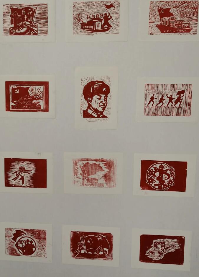 红船、党旗、华表、长城、雷锋……一个个由具有红色记忆标识的象征物图案印刻而成版画作品,让人不由想起关于党和祖国的光辉历程。
