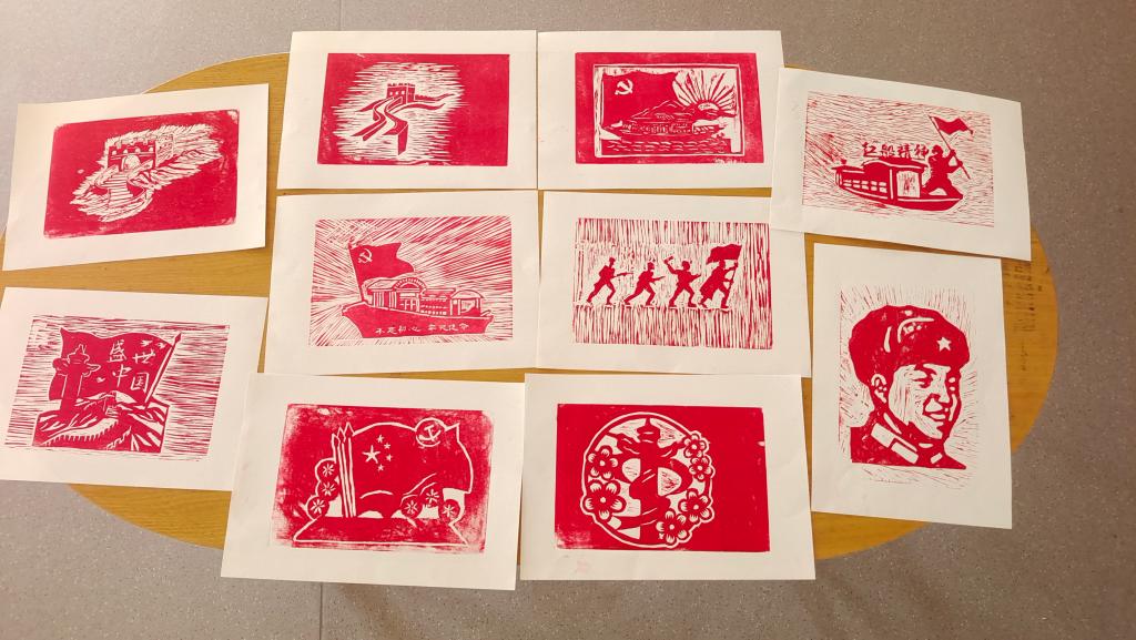 图书馆见琢版画工坊的刘臻老师说:“看到活动通知,作为一名老党员,我就萌发了利用自己所长,刻制版画向祖国献礼的想法。”于是,她认真挑选红色主题的图案,转印、上胶,再交由党员们分别刻制。