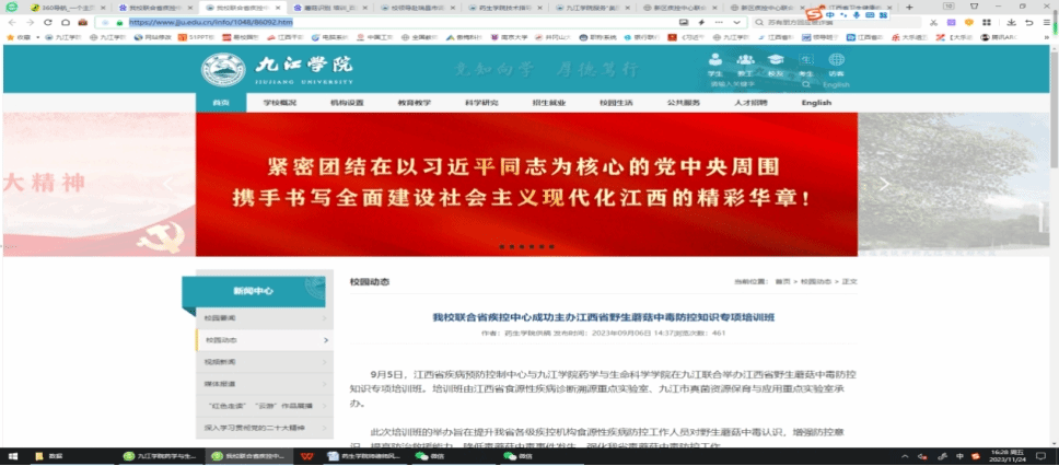 思政工作亮点纷呈。持续打造“药心向党,立德树人”“药心向党,成人成才”党建品牌,在学院网站陆续推出“生命与道德讲堂”“身边好榜样”“党课教育”“就业服务”“校企合作”等宣传专栏,综合运用智慧团建、青年大学习网络平台、QQ、微信,重点推送学习贯彻习近平新时代中国特色社会主义思想及其主题教育系列活动,成立青年理论学习小组和大学生宣讲团,其中一项列入2023年全国大学生井冈山精神宣讲团,在全院范围内推行《药学与生命科学学院推动二十大精神进班级、进课堂、进头脑活动方案》,逐步强化线上宣传阵地建设,营造浓厚学习氛围。学院多次获得九江市“三下乡”社会实践活动优秀服务队,省“三下乡”社会实践活动优秀个人,学校“五四红旗团委”、优秀基层学生分会等荣誉;积极响应国家政策,整合大学教育资源,服务周边区域,打造“走进社区,助力双减”志愿服务项目品牌。《食品营养学》《天然药物化学》《药物化学实验》《生药学》《食品添加剂学》先后获批九江学院课程思政示范课。