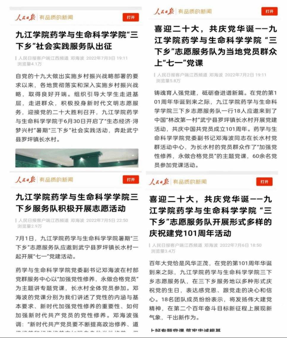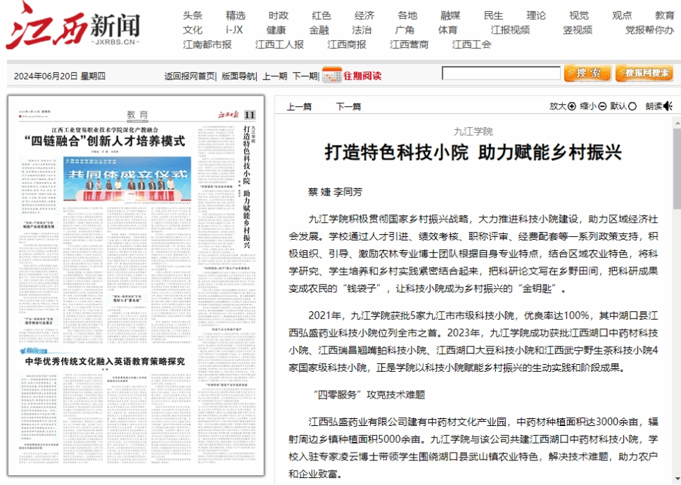 学校与江西博莱大药厂有限公司合作建设的九江市博正生物科技产业研究院成为江西省首家具有CNAS资质第三方检测机构、首家具备GCP资质的单位。与石药集团江西金芙蓉药业有限公司在汉防己及颠茄草的质量控制方面建立了长期合作,促进了近千名村民增收致富。研究团队与江西丹霞生物科技股份有限公司开发出栀子油、栀子黄色素、栀子苷、栀子蓝色素及紫薯花色苷系列产品,为企业增收效益显著。依托资源优势,培育出“赣通1号”和“赣通2号”两个木通新品种,在武宁县推广种植,取得较好的效益。真菌学研究团队与省市疾控中心紧密合作,开展野生蘑菇中毒预防救治和科普宣传,精准鉴定中毒蘑菇物种,助力医院有效施治。2023年5月23日深夜,药生学院2位博士星夜驱车305公里路程,从九江赶到贵溪市人民医院,为救治患者生命提供帮助,事迹被新华社和江西省政府报道。