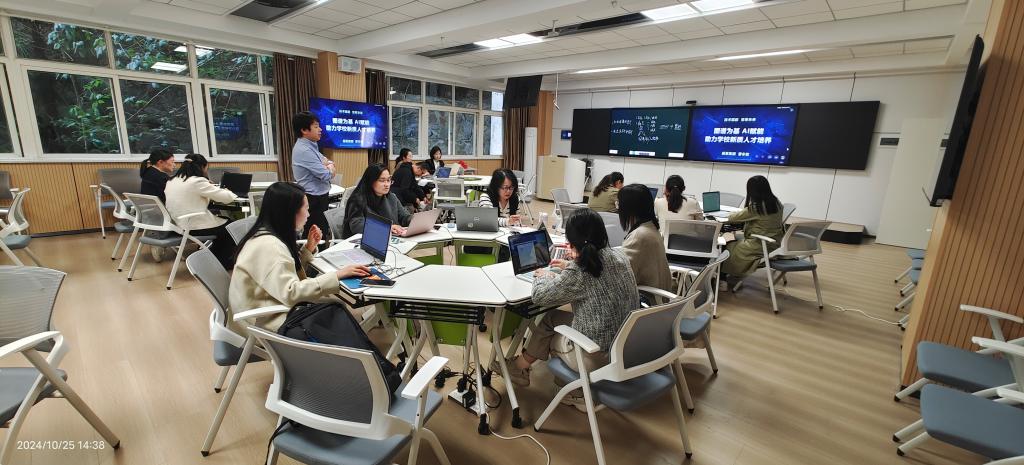 本次工作坊以“图谱为基 AI赋能—助力学校新质人才培养”为主题,采取“理论引领+实操演练”的双重模式。曹冬铭首先从知识图谱的设计和课堂教学活动创新两个方面进行理论讲解,并以国内其他高校知识图谱创新课程建设,助力教育教学发展为例,重点讲解了知识图谱创建过程以及其在教学实践中的应用。在实操演练阶段,各教师在培训教师的协同指导下掌握了课程知识图谱的整体设计、知识点提取、知识点关系梳理、知识点样例设计及内容补充、问题图谱设计、问题关联知识点等各个建设环节,并就在课程知识图谱创建过程中的疑问及技术难题进行了讨论与交流。