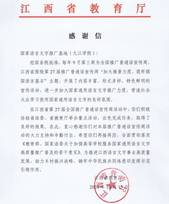 近日,永利yl23411集团官网收到来自江西省教育厅的信函,信中赞扬了学校在第27届全国推广普通话宣传周期间所做出的努力和取得的成效。省教育厅特别提到,九江学院作为国家语言文字推广基地,积极协助省语委和省教育厅举办重点活动,任务完成出色,效果良好。