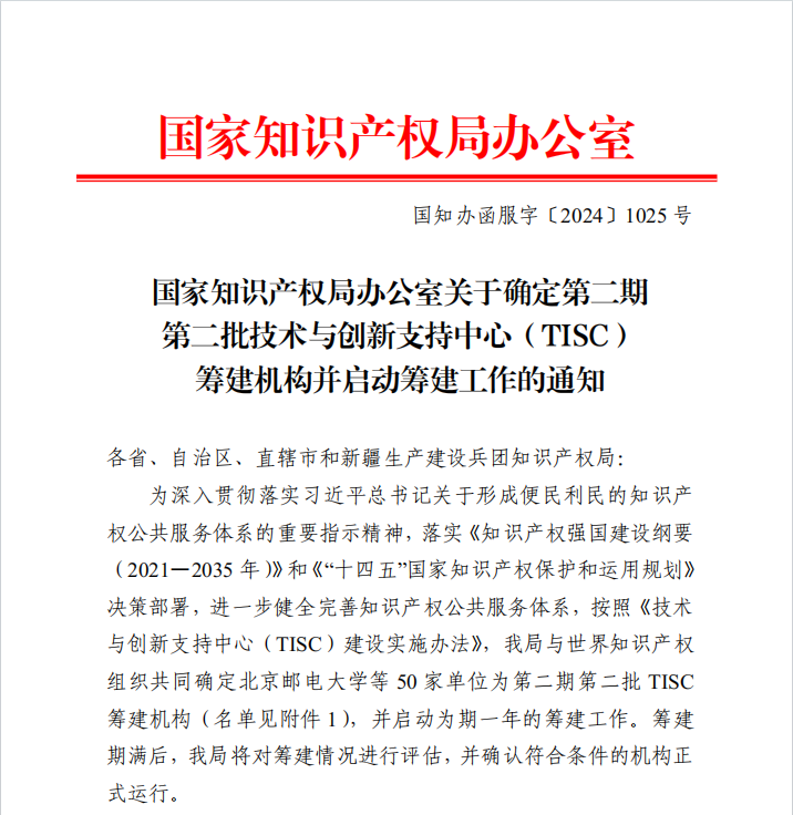 近日,根据国家知识产权局办公室印发的《国家知识产权局办公室关于确定第二期第二批技术与创新支持中心(TISC)筹建机构并启动筹建工作的通知》,九江学院入选世界知识产权组织(WIPO)在华技术与创新支持中心(Technology and Innovation Support Center,TISC)筹建机构。一年筹建期满后,经评估符合条件可正式运行。
