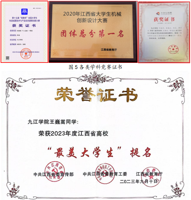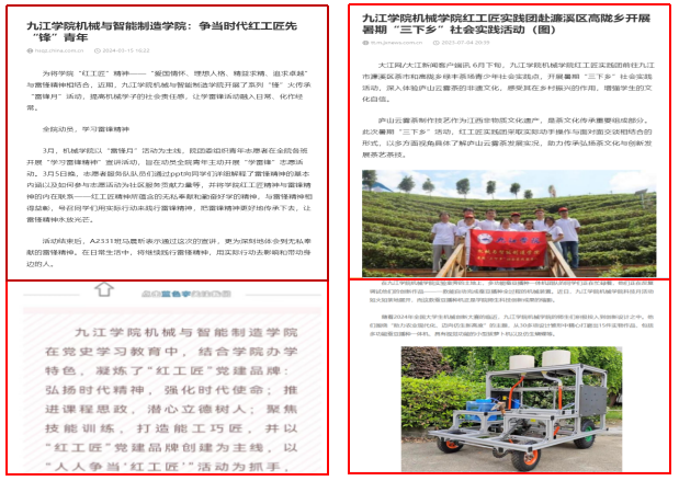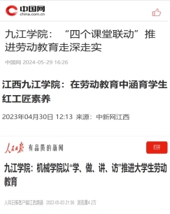 1.“红工匠”精神深融育人全链条,“三融三育”成果荣登主流媒体。将“工匠精神”等思政元素融入课程教学、教育活动、实习实践等专业人才培养的全过程,培养学生的红工匠精神。《学习强国》专题报道了“红工匠精神结硕果”;《中国日报》以“九江学院:机械学院三融三育红工匠”为主题进行报道,人民日报、中国教育、江西教育电视台等重要媒体对本成果进行经验推广。