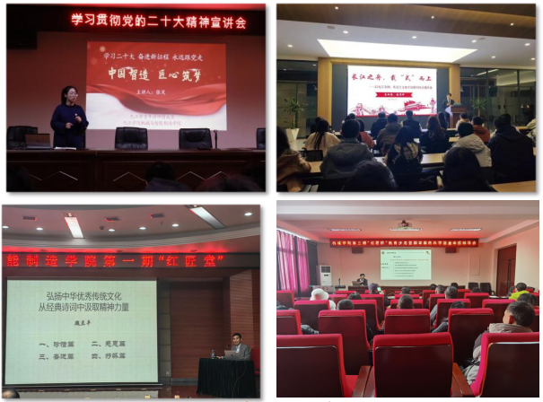 学院坚持党建引领,始终坚持把党的建设融入学院中心工作。学院落实立德树人根本任务,坚持把培养“德智体美劳全面发展的社会主义建设者和接班人”作为最大的责任担当,将“执着专注,精益求精,一丝不苟,追求卓越”为核心的“工匠精神”融入教育教学和人才培养全过程,精心培育“红工匠”党建品牌,并取得积极成效。先后获批3项江西省高校党建研究项目,教工一支部获批九江学院“样板支部”和“双带头人”示范工作室培育建设单位。学院党委连续多年获评九江学院先进基层党委。“红工匠”党建品牌被列为九江学院党建品牌建设培育项目。