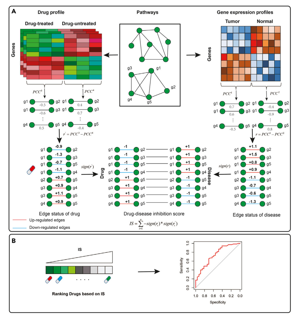 药物重定位是一种寻找已获批药物新治疗适应症的有效策略。目前,许多基于基因或通路层面的计算方法被提出以优先筛选抗癌候选药物。然而,这些方法忽视了基因间相互作用的变化。为突破这一局限,我们开发了一种基于边信息和通路拓扑结构的计算药物重定位方法(iEdgePathDDA)。首先,我们利用皮尔逊相关系数识别通路内药物诱导的基因互作边变化(drug-induced edges)和疾病相关的基因互作边变化(disease-related edges);其次,通过计算药物诱导边与疾病相关边间的抑制分数(inhibition score);最终依据所有疾病相关边的抑制得分对候选药物进行优先排序。案例研究表明,本方法基于CTD数据库成功识别了新的药物-疾病关联对。与现有方法相比,在结直肠癌、乳腺癌和肺癌数据集上,我们的方法在五项评价指标中均展现出更优越的性能。