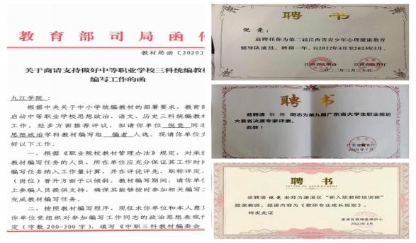 学院依托人文教研室心理教育优势,通过培训讲座、赛事参与、课题教材开发、课程建设、咨询辅导、自媒体宣传等途径,推广心理健康教育。自“十四五”以来,教师参与江西省“百场辅导进百校”活动,在中小学及企事业单位举办讲座30余场;担任江西省首届女性职业规划大赛及广东省第九届大学生职业规划大赛评委;参与编写《心理健康与职业生涯》国家教材,立项教改课题1项,获教育集团横向课题经费30.5万元。学院开发《爱情心理学》等线上精品课程,覆盖全国1052所学校,教师担任九江市青少年心理健康服务中心咨询师,提供超800小时咨询服务,自媒体推送500余篇原创文章,阅读量超百万次。