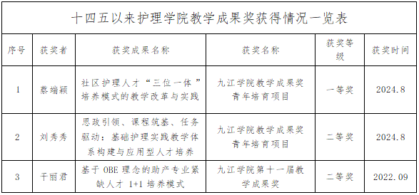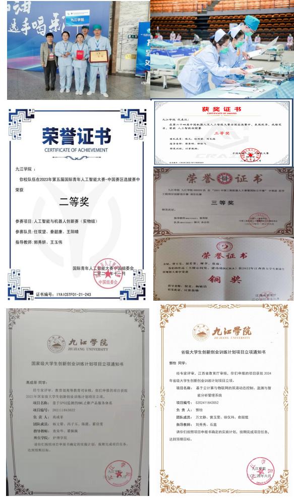 学院以省级一流本科专业及护理学硕士点建设为契机,秉持“仁爱、专精、协同、创新”院训,形成“护教协同、科教融合”理念下“重人文、强实践、促科研”的人才培养模式,构建“层次+模块+环节”(LML)实践教学体系。“十四五”期间,学生在国家级护理技能大赛华东分区赛获二等奖1项,一带一路校园急救赛优秀奖1项,江西省职业规划大赛铜奖1项,机器人及人工智能大赛全国三等奖1项、省级三等奖1项。学生发表论文8篇,参与专利4项,获校级创新创业大赛银奖4项、铜奖5项,立项国家级创新创业项目1项、省级7项。