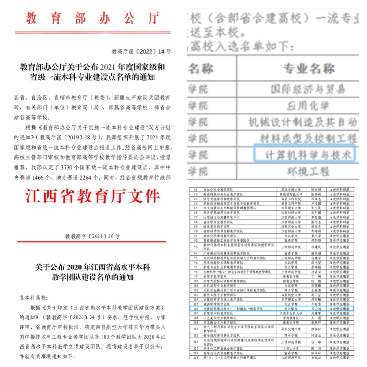 学院突出教学工作中心地位,精准把握行业跳动脉搏,不断深化教学内容和课程体系改革,强化教学质量监控,注重大思政课建设,促进教学科研相长。计算机科学与技术专业入选江西省一流本科专业建设点。获江西省高水平本科教学团队1个、江西省教学成果奖二等奖2项、省级课程8门、教育部产学研协同育人项目46项、大学生创新项目30余项(其中国家级6项),国家级大学生创新创业训练项目1项,获校级课程思政示范课程4门、校级校企合作课程4门、校级校企(行)合作教学团队1个、校级示范性实践教学基地2个,2名教师分别获校教师课堂教学竞赛一等奖、二等奖。