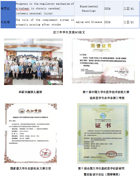 在“强能力”方面,九江学院临床医学院成果斐然。着力提 升学生科研创新能力,倾力实现教育报国、教育强国梦。落实新 医科和医学教育创新发展要求,推进人才培养模式改革,开设“久 毅班”,打造高端复合型医学人才培养品牌。久毅班作为教育教 学改革的重要组成部分,旨在培养本科学生的科研水平和创新能 力。通过这一人才培养模式,学院已经取得了显著的成效。在 “第 十届全国大学生基础医学创新研究暨实验设计论坛总决赛” 中, 九江学院的团队荣获全国总决赛三等奖,这一成绩不仅展现了学 校师生卓越的医学科研创新精神,也体现了 “久毅班”对医学本科生科研能力培养的成效。近三年来,学院以本科生为第一作者 发表的论文达20 余篇,其中SCI 论文 10 篇,充分彰显了学 院在培养学生创新能力和科研水平方面的显著成效。