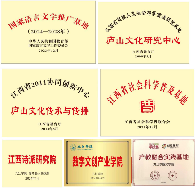 依托文学院建设的科研平台众多,包括国家语言文字推广基地(九江学院)、江西省高校人文社会科学重点研究基地(庐山文化研究中心)、江西省社会科学普及基地(书院文化传播与应用研究中心),以及与各方共建的江西诗派研究院、数字文创产业学院等多个科研机构。