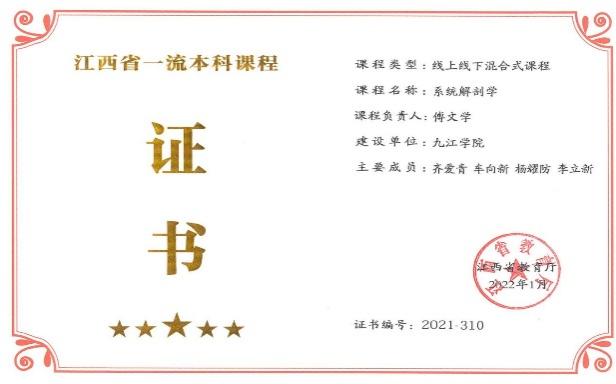 基础医学整合创新实验教学团队获批2022年江西省高水平本科教学团队以及九江学院校级教学团队建设点。血吸虫病实验室诊断与健康教育虚拟仿真实训系统虚拟仿真实验教学项目获评江西省虚拟仿真实验教学项目。医学生物化学与分子生物学和系统解剖学获2020年省级精品在线开放课程,系统解剖学与药理学获江西省2022年线上线下混合式一流课程。2人次获江西省青年教学竞赛医科组二等奖。此外,学院还获省级教改课题4项、教育部产学研合作育人项目3项、校级课程思政示范课程3门、校级教学成果二等奖4项。