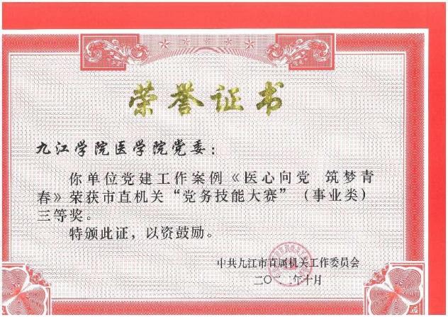 学院通过“六个一工作模式”创新思政教育方式,打造思政教育课外平台:一个“医心向党”红色学习小组,一个“医心向党”红色走读小分队,一支九医杏林青年志愿者服务队,一个九医立德讲坛,一个“九医杏林园”团委微信公众号,一个“医心聊吧”交流平台。“医心向党”红色走读作品分别荣获第十八届“挑战杯”红色专项校赛特等奖和二等奖。九医杏林青年志愿者服务队已与十多个单位建立对接志愿服务关系,暑期结合“三下乡”开展志愿服务活动,获“九江日报”“江西思政”“中央共青团”等主流媒体报道,并被九江市授予优秀志愿服务队,获得2023年全国大中专学生“三下乡”社会实践活动之乡村振兴“笃行计划”专项行动全国示范性团队;荣获全国善行100志愿活动“爱心团体”;入选2024年全国大学生井冈山精神志愿宣讲团。“九医杏林园”微信公众号传递正能量,牢牢占领学生思想阵地,获九江学院2020年度最受喜爱新媒体奖、2023年度优秀新媒体账号。
