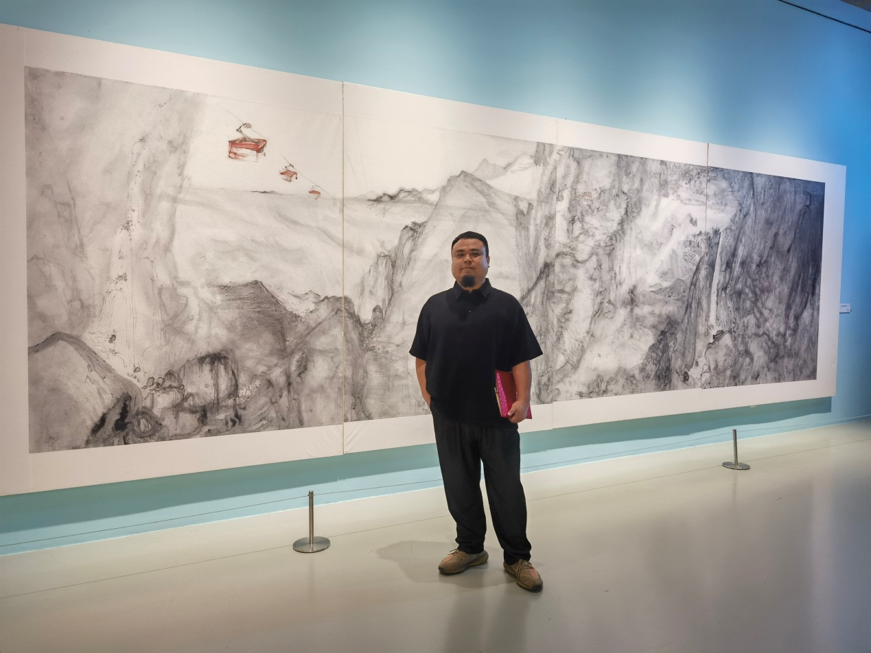 建工学院教师何微毕业于中国艺术研究院,此次获奖作品为水墨巨制《庐山烟雨浙江潮》,以雨中庐山为母题,将如琴湖、五老峰、牯岭街、三叠泉等标志性景观熔于一炉。画面随烟雨氤氲铺陈,墨色浓淡间忽明忽暗,既见泼墨洒脱之姿,亦含笔线精微之妙,营造“可居可游”的沉浸式山水意境。作者以传统水墨为骨,融入当代审美,通过虚实相生的章法,让庐山的灵秀与烟雨的朦胧浑然一体,既具地域文化特质,亦显文人画“外师造化,中得心源”的精神追求,是其深耕本土自然与人文的代表性创作。