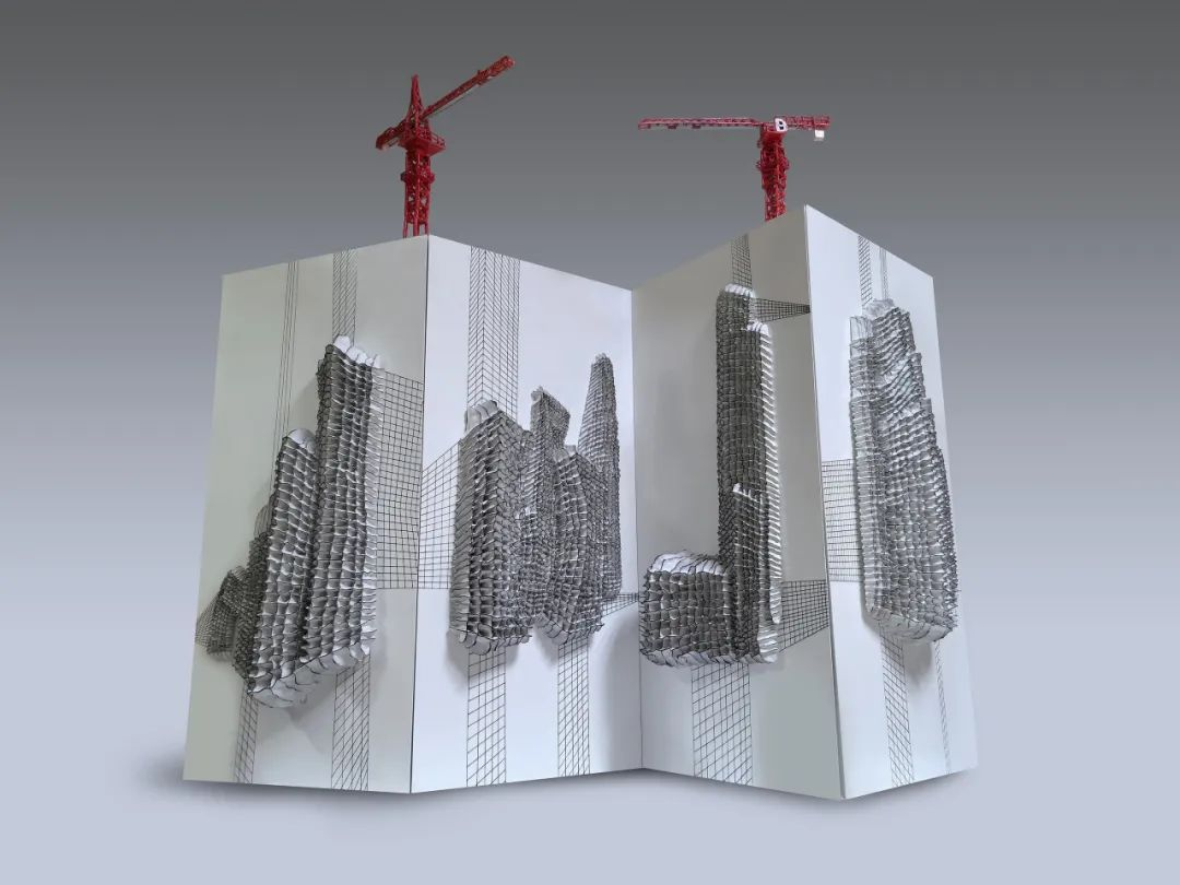 艺术学院教师谭丹武毕业于中央美术学院,其获奖作品陶瓷雕塑《大国筋骨——城市天际线》是其近几年“筋骨”系列作品的延续。灵感源自陶瓷印坯工艺内部的支撑结构,称之为“筋”,这种骨架结构与现代建筑中的钢筋水泥具有相同的功能。作品以中国城市中的现代建筑为创作对象,旨在呈现新中国成立以来在城市建设中取得的瞩目成就,见证大国建造和中国速度的辉煌成果。顶部的塔吊加入了动态装置,能更生动形象地展现出建设过程的活力与动态。创作采用手捏成型的方式,这能更好地表现泥土本身的材料语言,通过透视线的延伸处理,加强对作品空间的想象力。作品中线条的造型语言、黑白的东方美学、留白的画面意境、屏风的折叠效果等都展现对中国传统艺术和审美的思考。