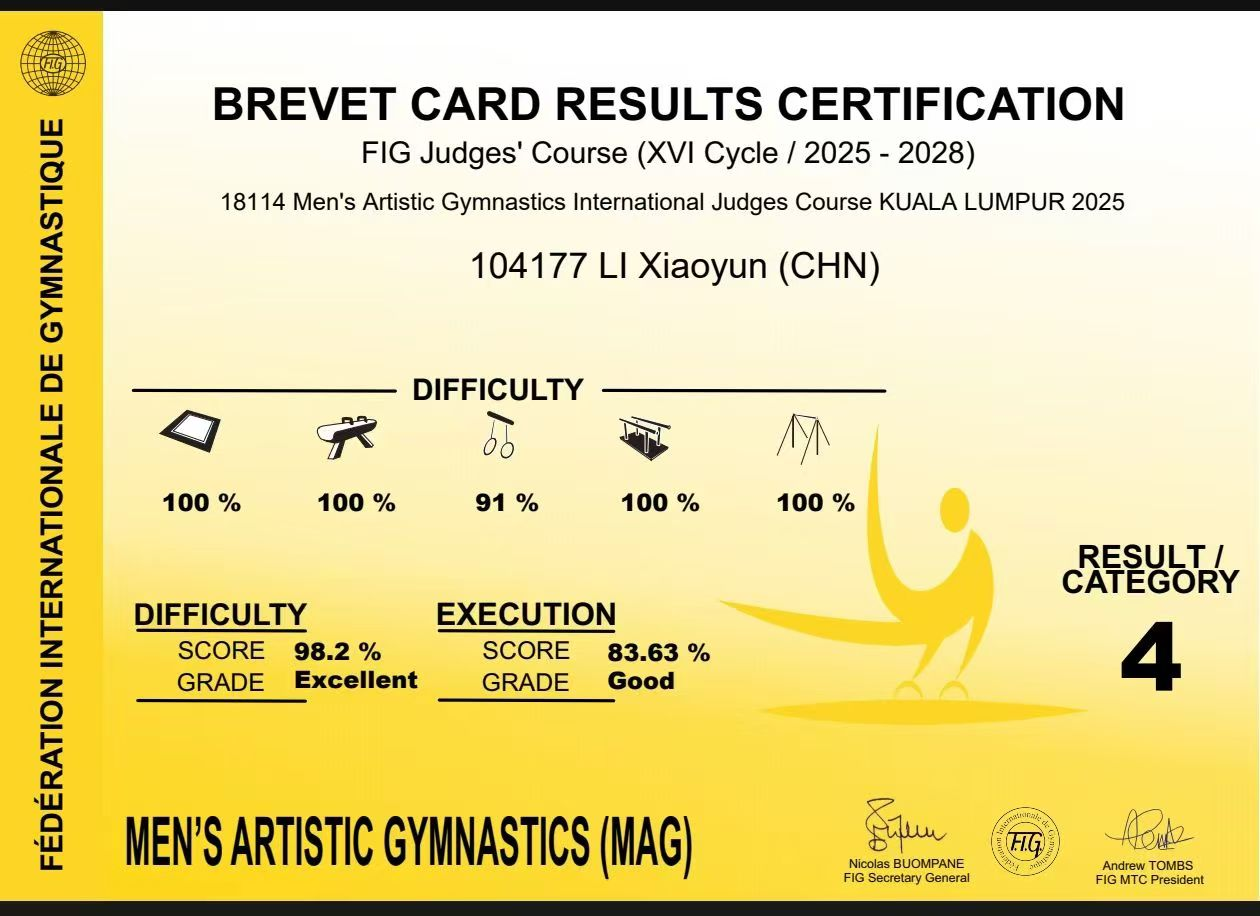 培训内容涵盖国际规则的最新修订、评分实践、案例研讨等多个方面,培训结束后组织了统一考试。李小云老师在各项考核中表现良好,达到了国际裁判资格评定要求。
