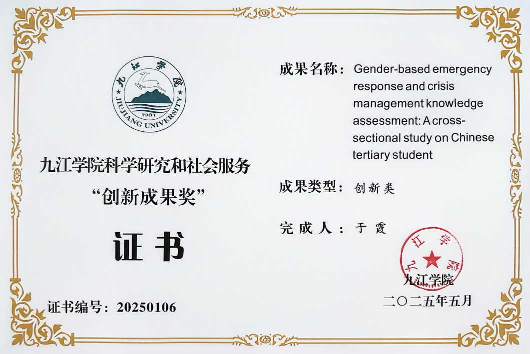 【科研创新成果展】于霞:Gender-based emergency response and crisis management knowledge assessment: A cross-sectional study on Chinese tertiary student
