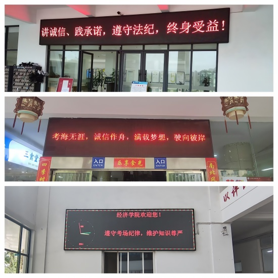 为强化考风考纪宣传教育,学校凝聚多方力量,构建多层次、全方位的诚信考试宣传体系。信息技术中心在校园网主页显著位置滚动展示诚信考试标语,确保宣传直达每位师生。教务处联合宣传部通过学校官方微信公众号发布《@四、六级考生,你准备好了吗?》专题推文,从备考建议、考场规则到违纪后果等方面为考生开展全方位提示,推文阅读量迅速达到5000多人次。图书馆、后勤管理处、各二级学院,分别在学校图书馆、学生食堂、教学楼等学生密集场所,通过电子显示屏循环播放宣传标语,营造抬头可见的诚信氛围。学生工作处组织各二级学院开展“诚信应考”主题班会等活动,切实增强学生的自律意识,让诚信考试的理念入脑入心。
