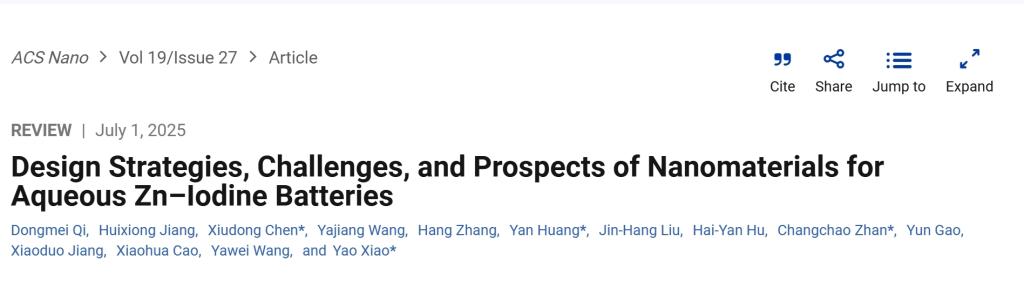 另外,陈修栋教授团队联合培养研究生齐冬梅同学以第一作者身份、以九江学院为第一单位,在《ACS Nano》上发表题为“Design Strategies, Challenges, and Prospects of Nanomaterials for Aqueous Zn-Iodine Batteries”的综述性学术论文。《ACS Nano》是美国化学会出版社旗下的纳米科学与技术领域的顶级期刊,为Nature Index收录期刊,中科院JCR分区为Top一区,影响因子为15.9992。该期刊在纳米科技领域具有重要地位,被广泛认为是该领域的权威期刊之一,其发表的文章往往代表了纳米科学与技术领域的最新研究成果和发展方向,对推动该领域的学术研究和技术创新具有重要作用,被业内公认为高学术质量科技期刊。