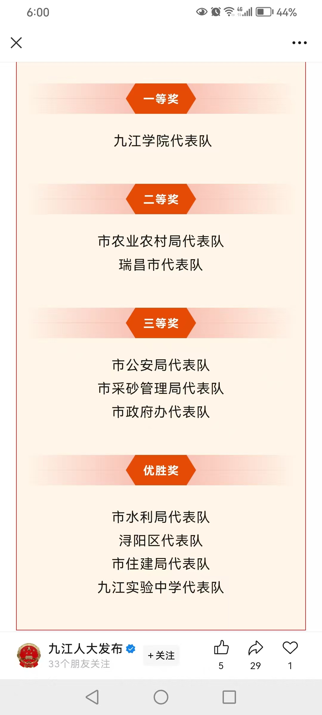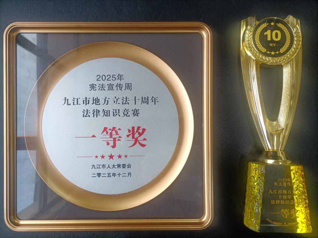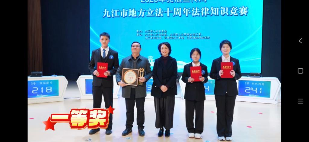 12月3日,在九江市举办的地方立法十周年法律知识竞赛中,九江学院代表队凭借扎实的法律功底、出色的团队协作和稳定的临场发挥,从众多参赛队伍中脱颖而出摘得大赛桂冠,荣获大赛一等奖 ,为学校赢得了荣誉。