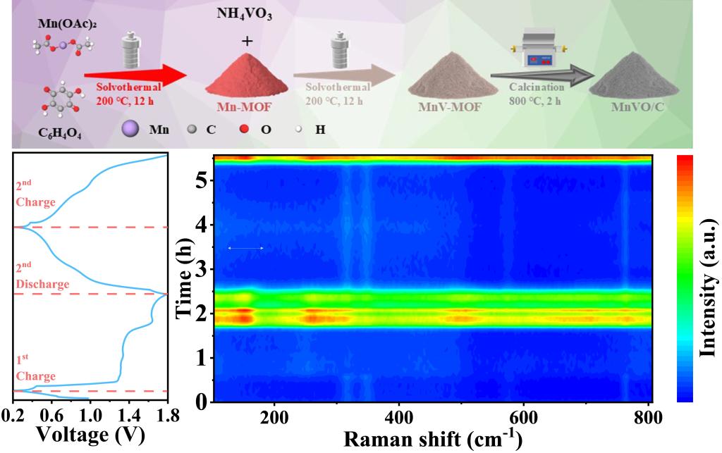 在《Chemical Engineering Journal》(中科院1区Top期刊,影响因子13.1995)上发表的题为“Suppressing Jahn-Teller Distortion and Accelerating Ion KineticsviaHeterostructure Engineering for Stable Aqueous Zinc-Ion Batteries”的研究论文中,团队创新引入稀土元素镱(Yb),通过MOF衍生法制备了Yb2O3-MnO/C异质结构纳米棒(MnYbO/C-2)。DFT计算证实,Yb₂O₃的引入可缓解Jahn-Teller畸变,降低H⁺与Zn²⁺的吸附能,强化结构稳定性。MnYbO/C-2在0.2 A g⁻¹下循环110圈后比容量达347.4 mAh g⁻¹,2 A g⁻¹下循环2500圈仍保持168.5 mAh g⁻¹的容量,其H⁺/Zn²⁺共嵌入机制通过原位拉曼与非原位表征得到证实。