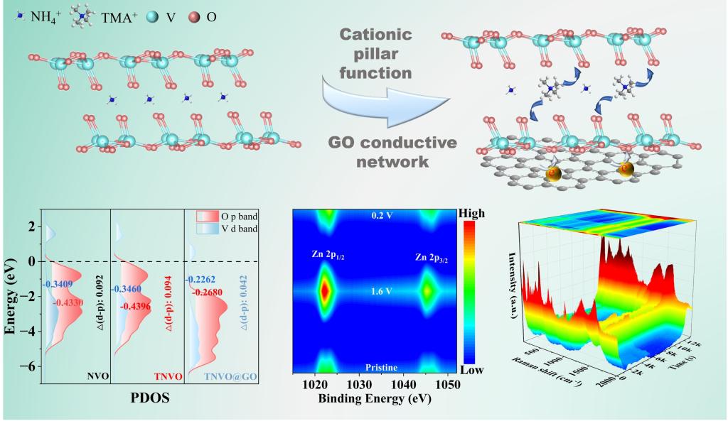 针对钒基材料的结构坍塌与导电性问题,团队在《Chemical Science》(中科院1区Top期刊,影响因子7.4001)上发表了题为“Dual-Functional NanoengineeringviaMolecular Pillaring and Conductive Hybridization for High-Performance Aqueous Zinc-Ion Batteries”的研究论文。论文中提出双功能纳米工程策略:以四甲基铵离子(TMA⁺)作为“分子支柱”部分取代钒酸铵(NVO)中的层间NH4+,同时与氧化石墨烯(GO)复合形成TNVO@GO纳米复合材料。TMA⁺有效抑制层间收缩,GO构建连续导电网络,协同提升结构稳定性与电荷传输效率。该材料在0.2 A g⁻¹下容量达438.2 mAh g⁻¹,6 A g⁻¹下循环3000圈容量保持率为84.6%,且柔性电池在弯曲状态下性能稳定。
