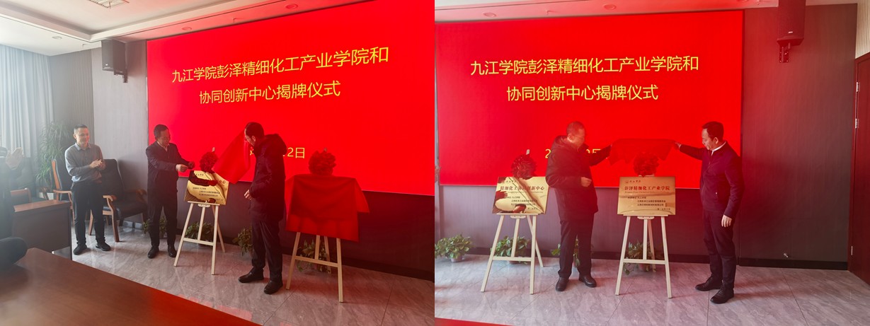 为了进一步落实学校“3353”战略,加强校企合作,促进产学研融合发展。2月12日,由九江学院化学化工学院、江西彭泽工业园区管理管委会携手九江善水科技股份有限公司、江西贝特利新材料有限公司联合组建的彭泽精细化工产业学院与协同创新中心揭牌仪式在彭泽县工业园区管委会举行。九江学院党委副书记王殿元,彭泽县委副书记叶子,化学化工学院党政主要负责人,工业园区管委会主任吴国豪,以及相关企业代表出席本次活动。