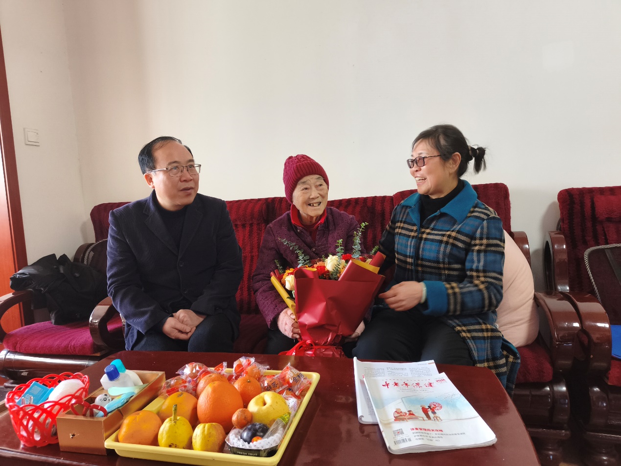 慰问现场,黄绍容老师身着喜庆的红色中式棉袄,虽已年过百岁,依旧精神矍铄、气色红润。黄老师用亲切的四川方言表达自己衷心的谢意,感谢学校和离退休工作处长期以来的关心与照料,并祝愿学校事业蒸蒸日上、再创佳绩。