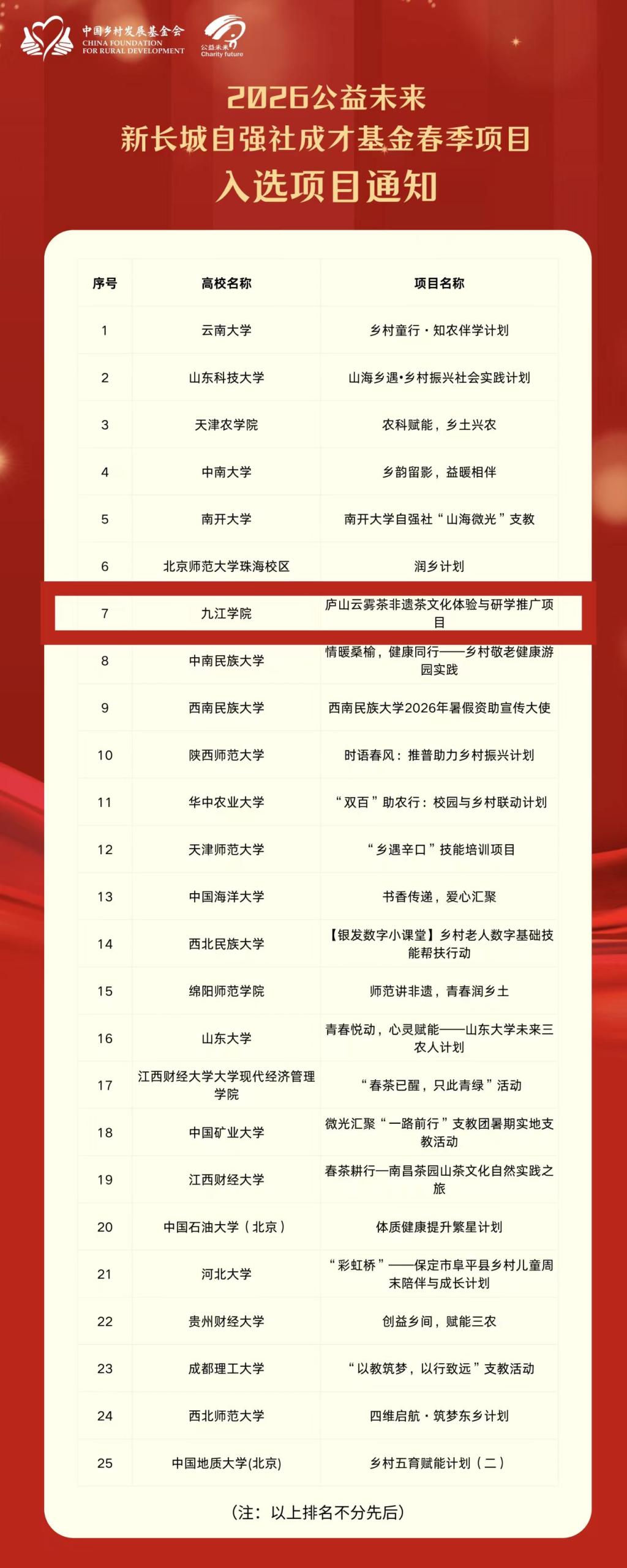 近日,2026公益未来·新长城自强社成才基金春季项目评审结果正式揭晓。由校学生工作处(学生资助管理中心)指导的新长城九江学院自强社申报的《庐山云雾茶非遗茶文化体验与研学推广项目》成功入选。本次春季项目原定支持16个名额,评审组结合申报项目整体质量增补9个名额,最终全国仅25个高校项目脱颖而出获得支持,永利yl23411集团官网项目成功跻身其中,充分彰显了九江学院青年学子立足专业、赋能乡村、传承文化、勇担使命的青春风采。